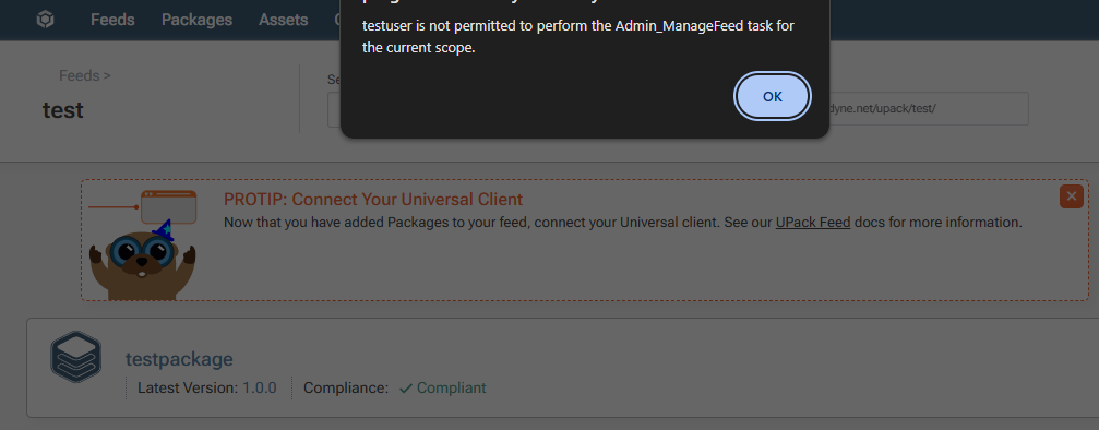A user with only 'Publish Packages' permission can't clear at least some ProTips. When they click the close icon on the ProTip, the error is displayed: "<username> is not permitted to perform the Admin_ManageFeed task for the current scope."
