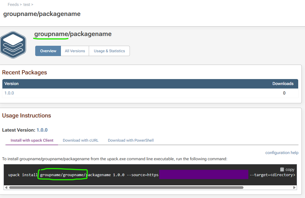 With universal packages - in the usage instructions, the 'group name' gets repeated twice in the usage instructions, in all 3 tabs, upack client, cURL and PowerShell: